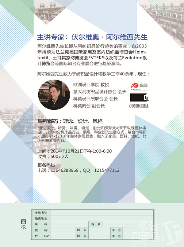 本次论坛的主讲专家为欧洲设计学院教授、意大利纺织品设计协会会长伏尔维奥•阿尔维西先生。阿尔维西先生生于1952年,在1973年与妹妹一起创立了自己的设计工作室“阿尔维西和阿尔维西”,致力于研发面料的设计和工艺。“我们的设计能为自己说话”是他们的口号,对于市场的持续钻研造就了他们对趋势的卓越演绎。作为讲师,主要针对趋势研发进行演讲。自2005年起,每年都为世界上最大的家纺用品博览会法兰克福展会进行趋势演讲,自2007年起,也为著名的土耳其家纺博览会讲解最新趋势。在中国的上海8月家纺展和深圳3月家居展都有演讲经历。阿尔维西先生还在大学任教。2007年起持续为欧洲设计学院以及意大利其他设计学院针对“纺织设计”主题进行授课,并担任欧洲设计学院科莫校区顾问、董事会主席。目前,阿尔维西先生还任意大利纺织品设计协会会长、科莫设计展联合会会长以及科莫商会副会长。同时还在其他多个致力于纺织品设计和教学的机构中担任要职。